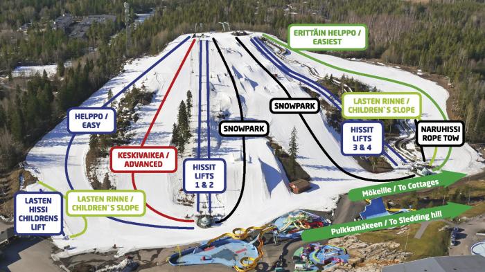 Keskuksessamme on yhteensä viisi valaistua rinnettä sekä kaksi lastenrinnettä, joiden kunnostuksesta huolehditaan päivittäin. Rinteiden korkeusero on 60 m ja pituudet 300-400 m. Lisäksi lautailijoille ja new school -hiihtäjille on kaksi street -rinnettä. Perheen pienimpien ja aloittelijoiden käytössä on maksullinen lastenhissi joka sijaitsee pääportin vieressä, sekä ilmainen lastenhissi joka sijaitsee 4. rinteen yhteydessä.